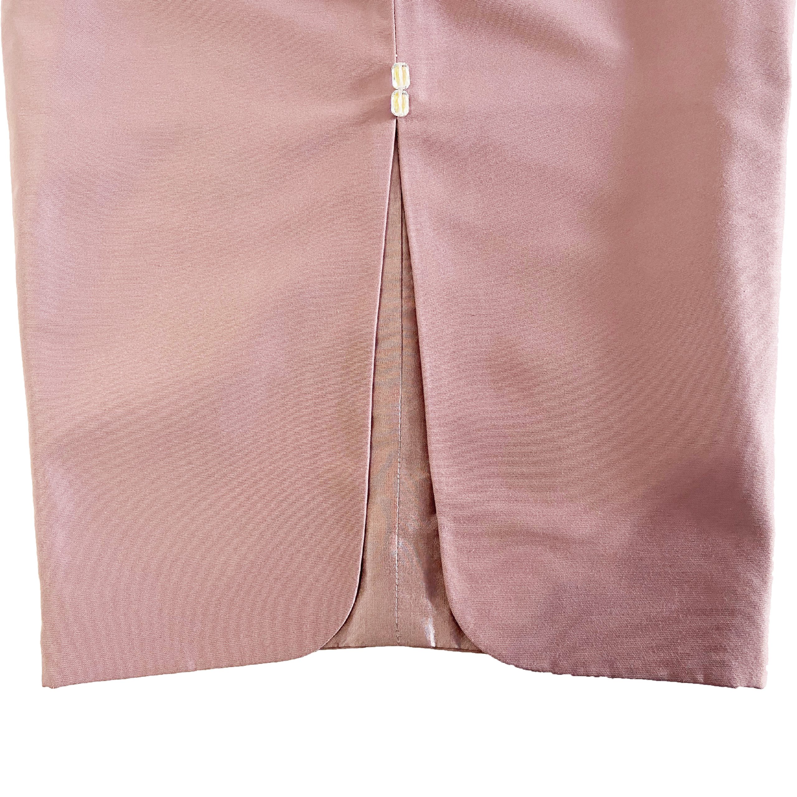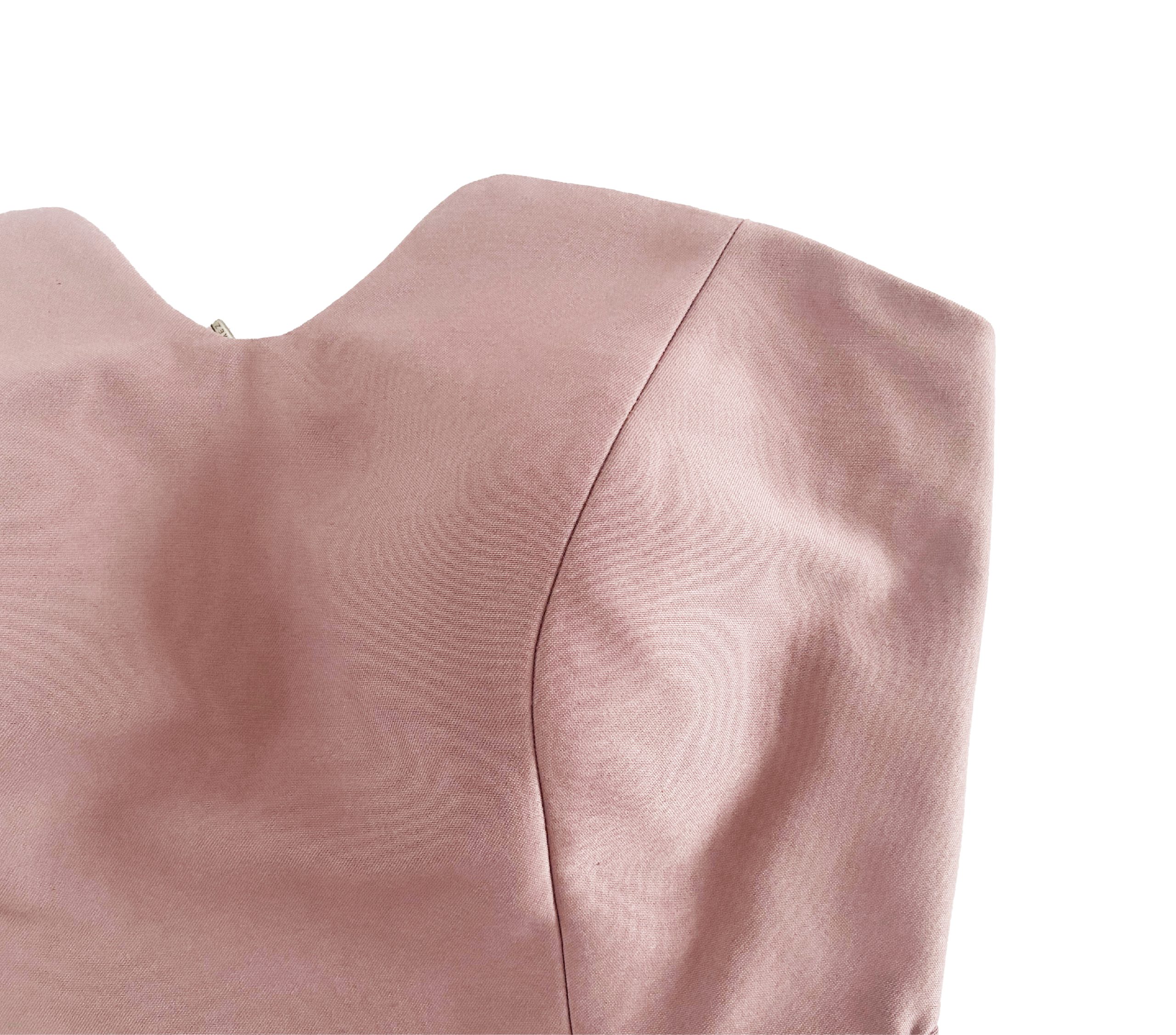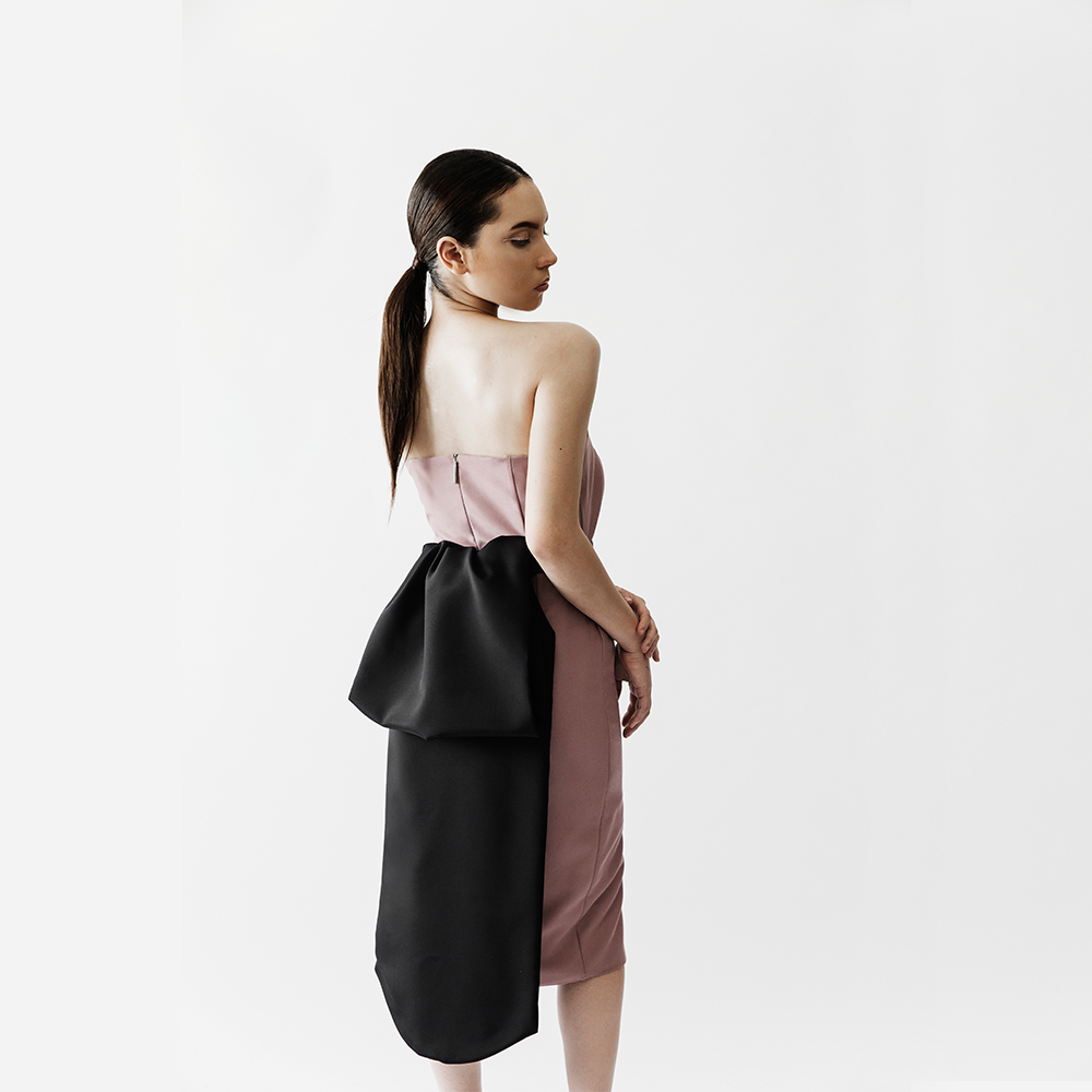 Este elegante vestido sin tirantes está elaborado con una exquisita mezcla de algodón que realza la figura. Luce una falda de abertura frontal con un motivo de dos cristales corte esmeralda y una cremallera invisible que remata con un tirador el sello Roberto Gómez. La pieza destaca por un cinturón tipo faja en Raso que define la cintura y forma media cauda.